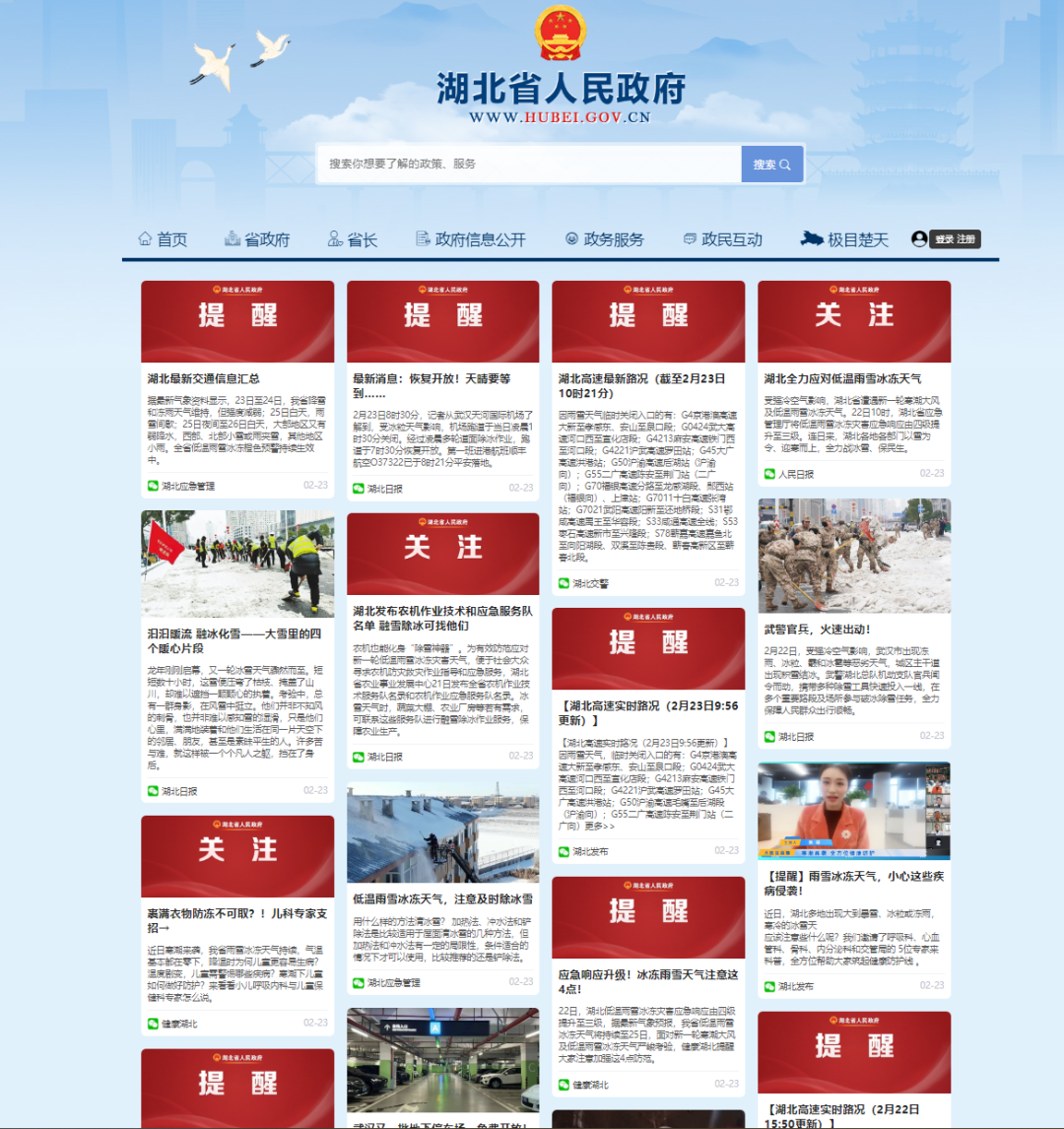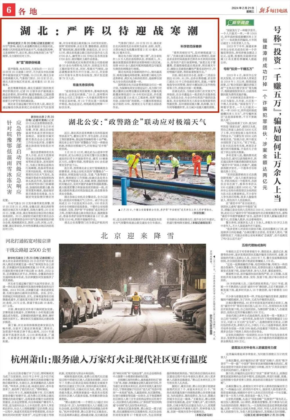 2月21日,新华每日电讯刊发了文章《湖北:严阵以待迎战寒潮》,关注湖北积极应对冰雪寒潮,降低恶劣天气带来的不利影响。