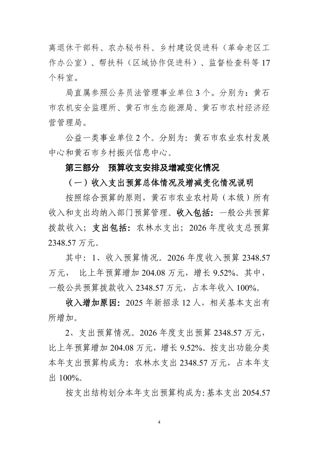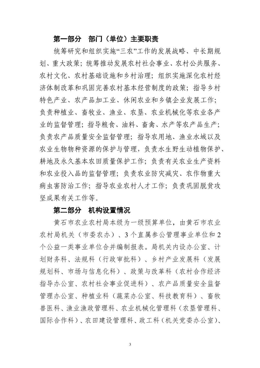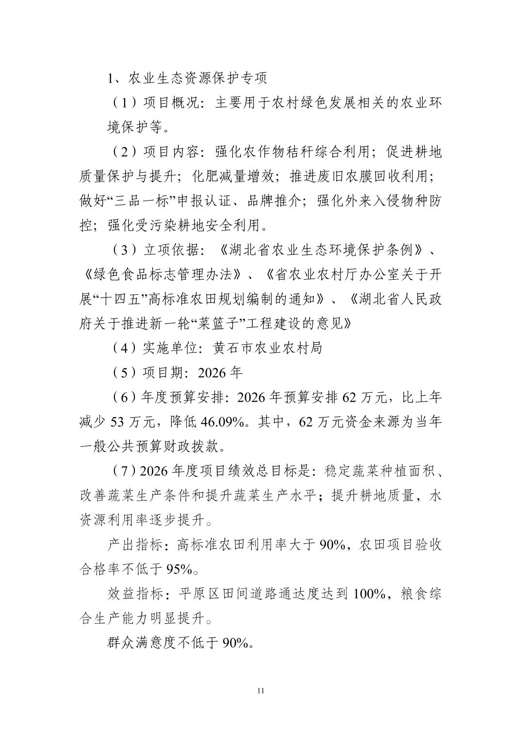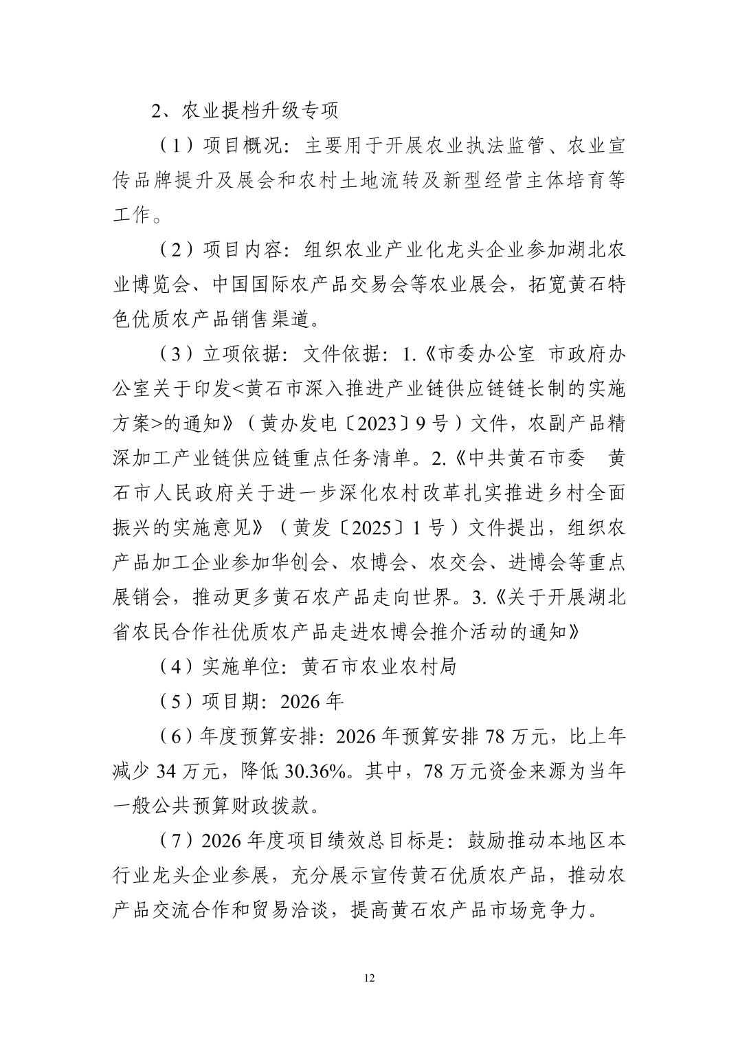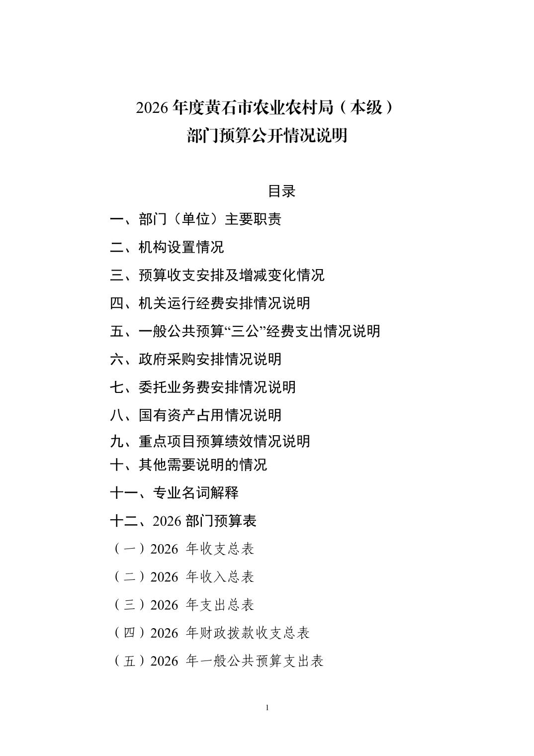 2026 年度黄石市农业农村局(本级) 部门预算公开情况说明