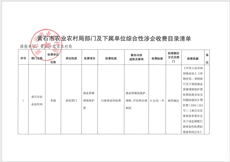 黄石市农业农村局部门及下属单位综合性涉企收费目录清单