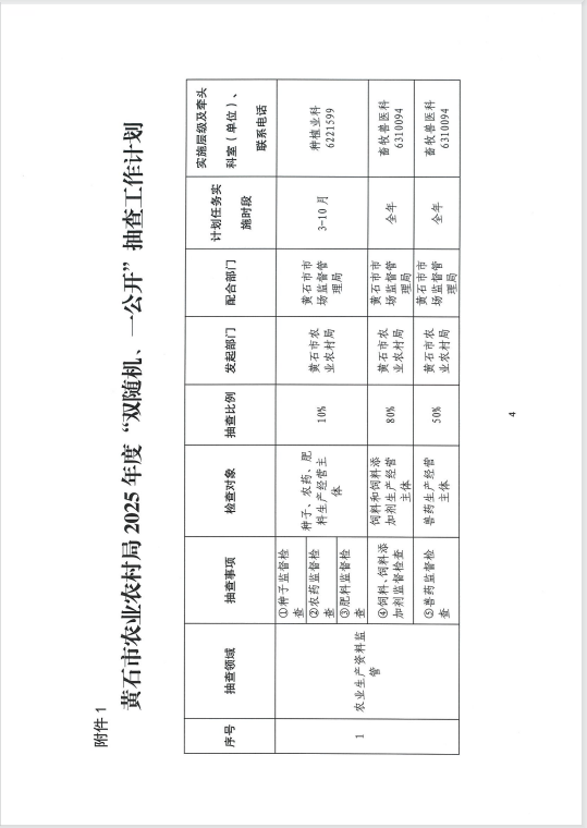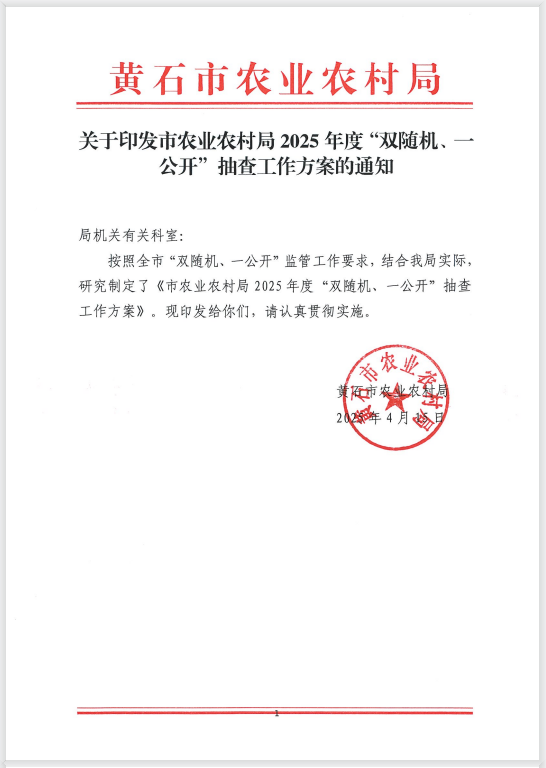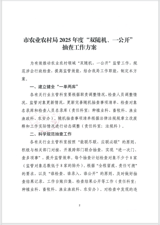 市农业农村局2025年度“双随机、一公开”抽查工作方案的通知