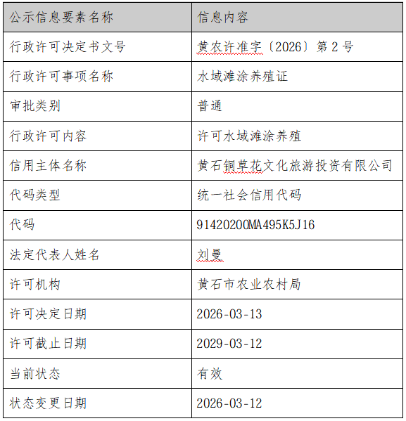 行政许可信息公示表(黄农许准字〔2026〕第2号)