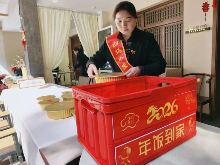 团城山白马小院餐厅,春节期间推出“年饭到家”服务。21日上午9点,记者来到该餐厅时,后厨内一片忙碌景象,厨师们身着工作服,有条不紊地切菜、炒菜,锅碗瓢盆的碰撞声此起彼伏,浓郁的菜香弥漫在整个后厨。